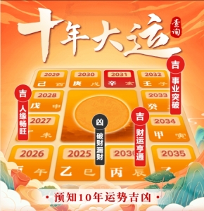 命运包含命和运,命是先天的八字,运是后天的运气,而大运就是人一生中每个时期(以十年为一个时期)的境遇好坏,一运管十年,所以被称为十年大运。